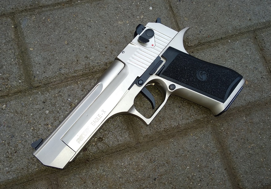 Ennek egyfajta megkésett “tribute”-ja a török Retay Eagle-X gázpisztolya, mely kb. 80%-os méretben másolja az eredetit. Ráadásul immár sokkalta élethűbb és műszakilag is igényesebb, mint az évekkel ezelőtt általunk is bemutatott (X-néküli) elődmodell. Ezt például 4 csavar kicsavarása nélkül könnyedén lehet szét- és összeszerelni.