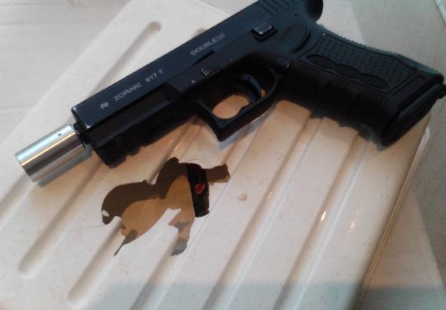 Kérdés még, hogy el lehet-e egyáltalán találni a támadót ezzel az eszközzel? A konzervdobozok 2 méterről nem volt feladat, de mi van messzebb? Erre vonatkozóan kimért 5 méterre tettem ki célt, és azon a Zoraki 917-tel 3 lövésből 5 centi alatti szórást értem el, melyek ráadásul pontosan a célzott pontba csapódtak be.