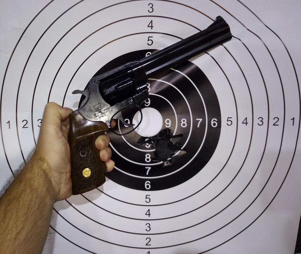10 méterről már nagyobb a szórás, DA-ban már érezhető a hosszú cső némi imbolygása, de a finom single action sütéssel bőven célfeketénél kisebb a szórás. Csak poénből 20 méterről (ami gumisnak irreális távolság) is kipróbáltam a hosszúcsövűt – 5 lövésből 3 még bőven mellkasnál kisebb területen csapódott be, de a szóráskép középpontja bőven a célzott pont alatt volt kb. 30 centivel.