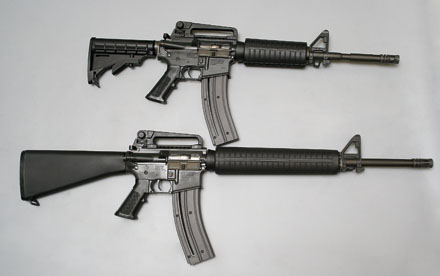 Vannak olyan országok, például az Egyesült Királyság, ahol a központi gyújtású lőszert tüzelő öntöltő puskák be vannak tiltva. Ott például .22 LR Ruger 10/22-eseket, Remington 597-eseket öltöztetnek fel M16-alakúra, vagy kis gyártók .223 Rem. modelleket alakítanak át .22-esre megfelelő váltókészletek permanens beépítésével.