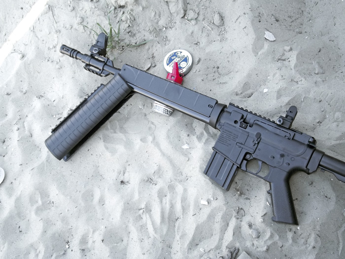 Az persze elsőre nyilvánvaló, hogy a fegyver nem 5,56×45 mm kaliberű gépkarabély, ehelyett a pneumatikus multi-pump légfegyverek közé sorolható be. Az ilyen kategóriás olcsó amerikai légpuskák ismerőinek nem meglepően, az előagyat kell lenyitni kb. 110 fokban, és visszacsukáskor préseljük össze a levegőt. Attól függően, hogy hányat pumpálunk, lesz erősebb vagy gyengébb a fegyver. Szobai vagy 8-10 méteres lövészethez 3 pumpálás bőven elegendő, ennél messzebbre 6-8 az ajánlott. Még így is éppen elérjük a 7,5 J-t ? megjegyzendő, hogy marketingokokból a gyártó által megadott magas lövedéksebesség a kb. 0,3 grammos acél gömblövedékekkel igaz csak.