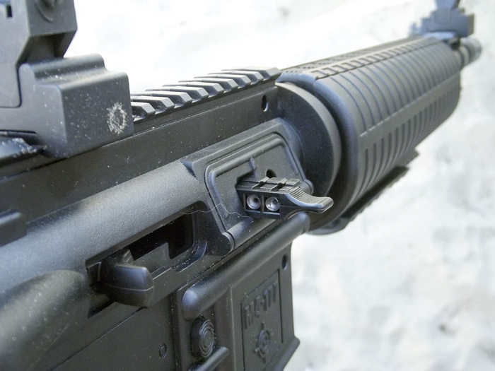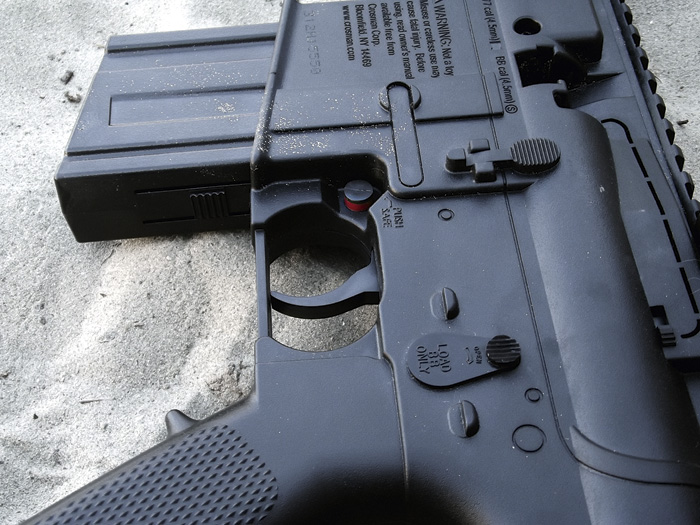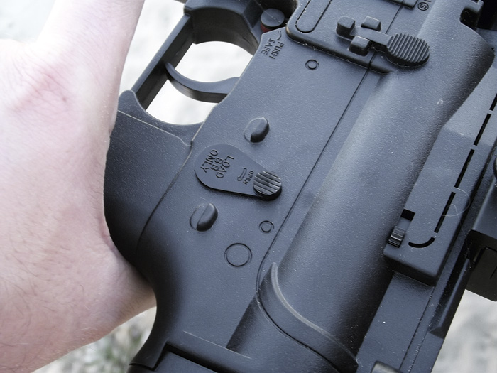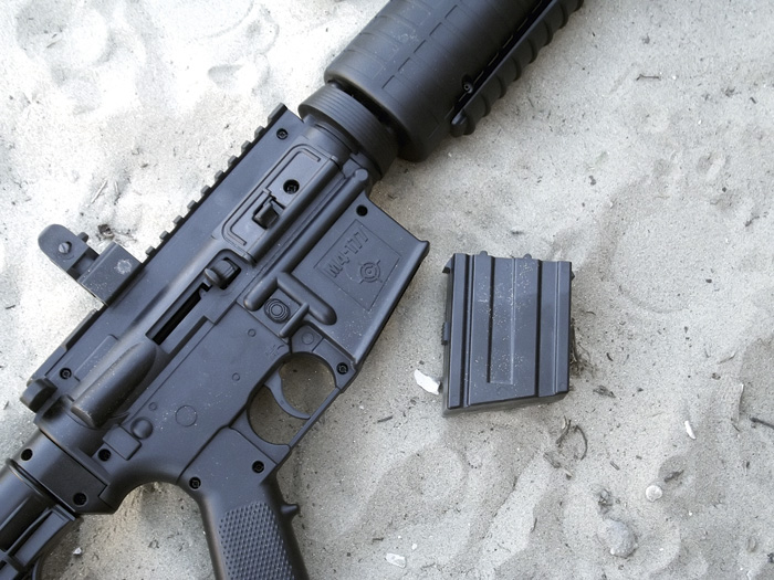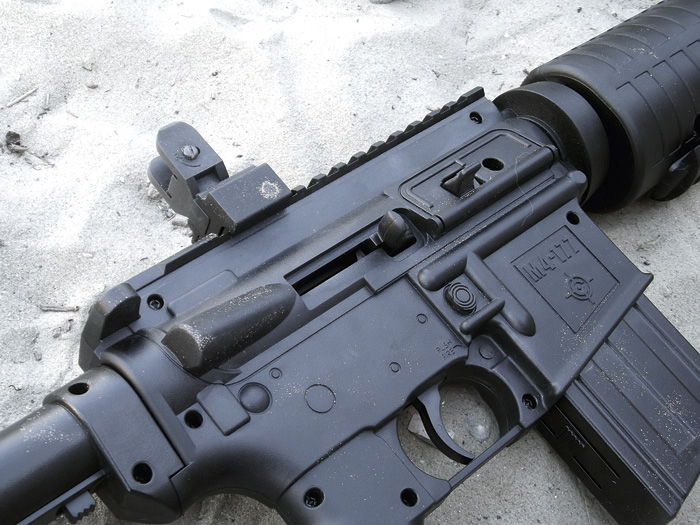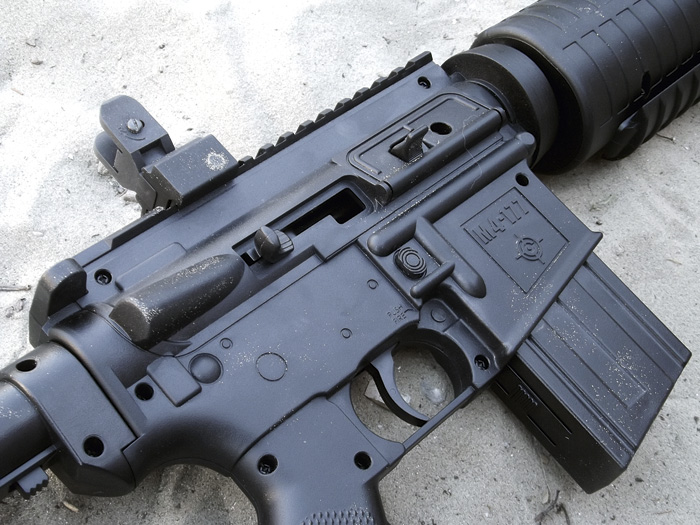 Azt már láttuk, hogy az előagy igazából pumpálásra szolgál. De nézzük meg a tárat is. Bizony, ezt már kivenni sem úgy kell, mint a rendes M4-esen, hanem pusztán össze kell nyomnunk a műanyagot elöl-hátul. Ez a ?tár? ugyanis nem tár, csak egy belül üres műanyagdarab, itt lehet például tartalék lövedéket szállítani.