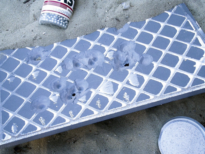 Acélgolyóval már annyira nem jött be, mert néha el-elszálltak lövések, illetve lendületesebb mozgásnál a mágnes időnként elengedte a lövedéket, ami szépen kigurult a csövön. Viszont itt a tárléptetés aktusa elmaradhatott szerencsére.