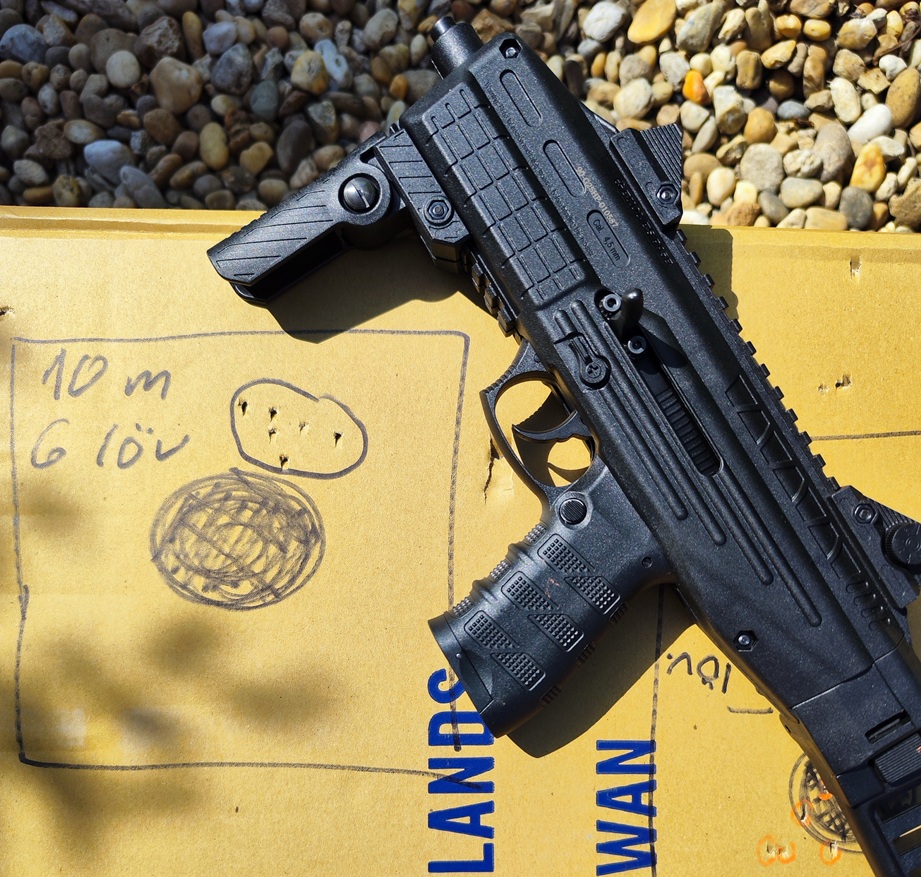 Vállba támasztva azért így is határozott gyorsasággal perforálhatóak a sörösdobozok 8 méterről – a kis acél g9mblövedékek simán átszaladnak rajtuk. Kipróbáltam 20 méterről is, de persze nem sörösdoboz ellen, hanem 5-literes AdBlue-s műanyag kannák ellen. Magabiztosan és villámgyorsan eltalálhatóak és szép kongó hangot adnak, ott már csak ritkán ütik át a műanyagot a 120 m/s körülis sebességgel induló lövedékek.
