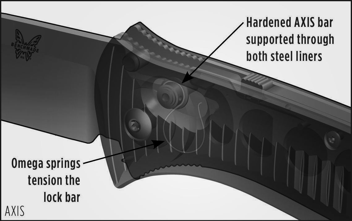 Maga az Axis zár nem egy bonyolult ötlet, ahogy az a Benchmade katalógusából származó képen is látszik. Egy 4 mm átmérőjű acél henger mozog az 1,5 mm vastag (valószínűleg 420-nak megfelelő) rozsdaálló acél alappanelekben kialakított ovális furatokban, és ez támaszkodik fel a penge tövébe mart felületeken, nyitott és zárt helyzetben rögzítve azt. A záróelemet a penge tövébe kényszerítő rugók egyik vége az alappanelekben kialakított furatokba kapaszkodik, a másik végét pedig a záróelem két végére rögzített nyitószemölcsök tartják a helyükön.