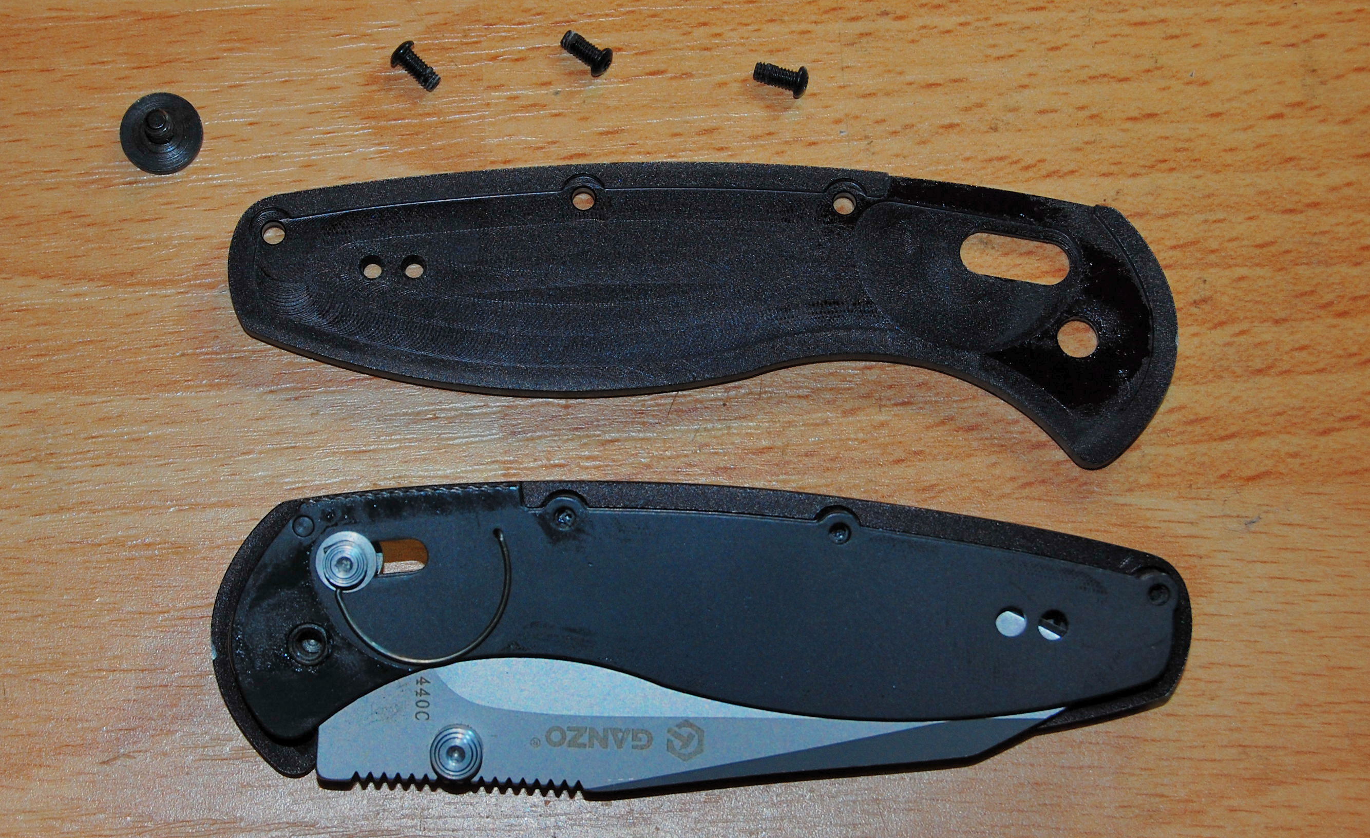 A penge a kínai gyártó jelzése szerint 440C rozsdaálló acél. (Nagyon sok késgyártó használja ezt az acélt világszerte, a nagy gyártóktól kezdve az egyedi késkészítőkig számtalan modellen találkozhatunk vele.) Az anyag jó éltartó, tulajdonságait tekintve a japán AUS8 acélra emlékeztet leginkább. A Ganzo (érdekes angolsággal olvasható) honlapján található, meglehetősen szűkszavú információk alapján 58 HRC környékére hőkezelteti a pengét. Persze a gyártói információk esetünkben azért kétségesek. Egy jelentős kínai internetes bolt szerint a ?kínai 440C? nem más, mint a 9Cr13MoV acél, amivel többek között a CRKT késein is találkozhattunk már.(Ez valóban nem rossz anyag, de összetételét tekintve közelebb áll a 440B acélhoz ? legalábbis ha hihetünk az acél-összehasonlító táblázatoknak.)