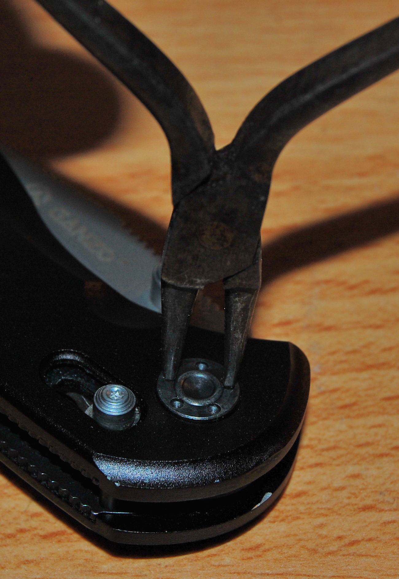 Mivel a penge nem rögzült biztonságosan (magától ugyan nem oldott ki, de minek kockáztassunk), mikrogéppel és gyémántreszelővel igazítanom kellett a penge tövén. A módosítás után a záróelem végre rendesen a helyére ugrott, és stabilan rögzítette a pengét.