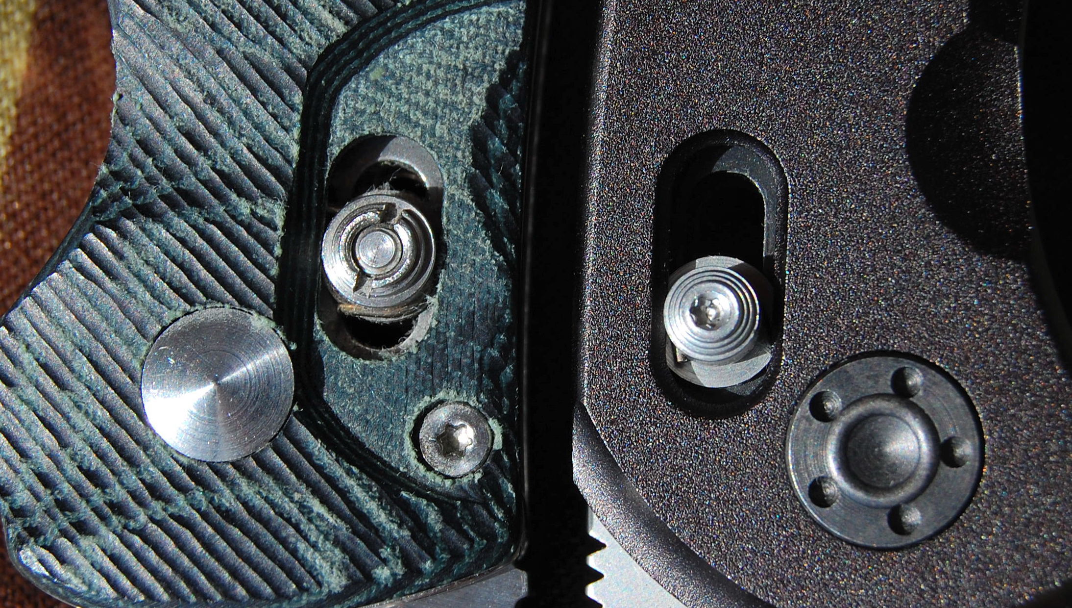 A penge egy 5 mm átmérőjű acél tengelyen fordul el, amit egy különleges fejkialakítású acél csavarral rögzítettek. A nyitási erő beállításához és a zsebkés szétszereléséhez különleges célszerszámra lenne szükség – én egy kisméretű csőrös fogó segítségével tudtam kitekerni az öt apró furattal ellátott csavart. A tesztelt példányon nem tapasztaltam nehézkes nyitást vagy kotyogást.