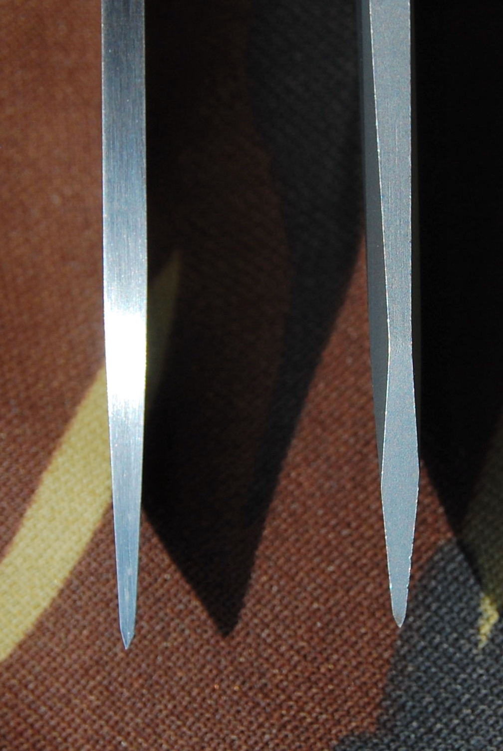 A penge a szokatlan amerikai tanto megoldásnak köszönhetően a hegytől 22 mm távolságban már teljes vastagságú, ami nagyon szilárddá teszi ? bár az 1,1 mm vastag hegyet már alapból sem nagyon kell félteni a keményebb használattól. A vágóél kezdeténél a penge 1 mm vastag, az alkalmazott élszög ~38 (oldalanként ~19) fok körüli volt. (Nehéz pontosan megállapítani, mivel meglehetősen lekerekített volt a vágóél, ráfért az élezés.) Ez napi munkákhoz megfelelő beállítás ? megjegyzem, a penge metszőképessége sokat javulna, ha esetleg 30 fok környékére átprofilozzuk.