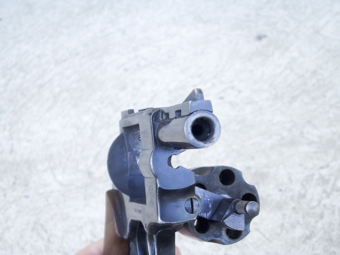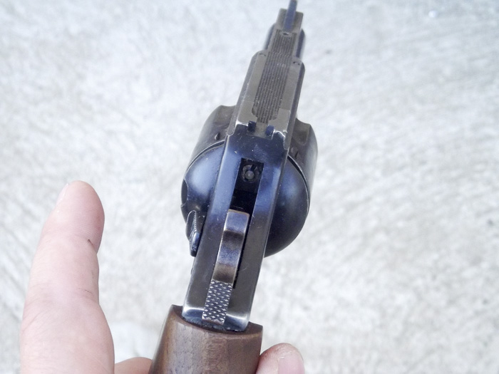 A többi hasonló formájú HW gázrevolveren a cső csupán spiáterköpenyes acél, addig itt masszív, kékített acélcsővel (kb. 2,75? hosszű) találkozhatunk. Ezen a HW38 modellek ventilált spiáter csősínjét találjuk, csavarral rögzítve.