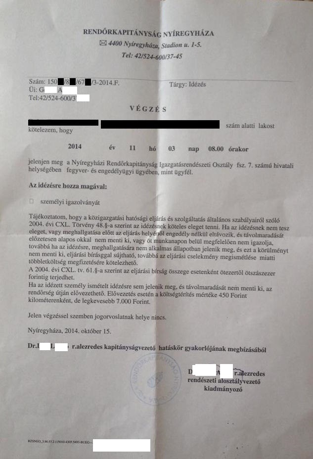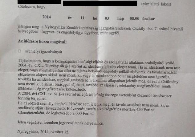 Majd bátorkodott telefonon érdeklődni, amire azt a választ kapta, hogy „gyártás alatt” az engedélye. Majd erre kettő héttel kapta a mellékelt dörgedelmes levelet. Vagyis nem levelet, értesítést, hanem IDÉZÉST, mint egy bűnöző. Benne olyan stílussal és szóhasználattal, amitől gyengébb idegrendszerű alattvalónak megremeg a lába.