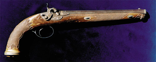 Az új fegyverek működési mechanizmusa csak a gyújtásban tért el a korábbi kovás fegyverektől, de előnyei világosan megmutatkoztak. A felporzó lőpor kiküszöbölésével az időjárás viszontagságai ( nedvesedés, szél ) többé nem zavarták a működöképességet, a durranóhiganyt tartalmazó csappantyú szúrólángja – amit a csappantyúra ütő kakas sokkal biztosabban keltett, mint a kovakő és acél összeütéséből keletkező szikra – pedig gyorsabban gyújtotta be a csőben lévő gyújtótöltetet. Röviden szólva a csappantyús pisztoly lényegesen kevesebbszer -mondott csütörtököt- mint kovaköves elődei. A bemutatott pisztoly nem katonai szabványfegyver, bár amikor Kiss Ernő tulajdonába került, ő a császári-királyi hadsereg ezredese volt. A tiszti fegyverek viselését viszont a korszakban nem kötötték szigorú szabályokhoz, a hihetetlen gazdagságú ( a Bánságban hatalmas birtokokkal és kiterjedt kereskedelmi érdekeltségekkel rendelkező ) Kiss Ernő pedig megengedhette magának, hogy a legkorszerűbb és legfinomabb kidolgozású pisztolyremekek közül válogathasson. ( Mindmáig Aradon őrzik Kiss Ernő párbalypisztolykészletét, ami szintén a prágai Lebeda műhely terméke. Jelenleg a Hadtörténeti Múzeum -Fényesebb a láncnál a kard c. kiállításán látható. ) A fegyver a prágai Lebeda műhely terméke, ami a kor Európájában az egyik legismertebb fegyvergyártó üzem volt. Egy párpisztol 2. számú darabja, amiről a nyolcszögletű cső felső részén a gyártó üzem felirata melletti szám tanuskodik. A gravírozott tokfark alatt aranyberakással PATENT LEBEDA A PRAGUE aranykeretes feliratot helyeztek el. Különleges, egyedi kialakítású a zárszerkezet is, ahol a lőkup ( amire a csappantyút helyezik a pisztoly tűzkésszé tételekor ) a cső irányába forduló halat formáz. Az irányzék csavarral állítható, a sátorvas gravírozott. Az igényesen kimun-kált, diófagyökérből készített faágyazat recézéssel díszí- tett, a markolat végén koponya van kifaragva.
