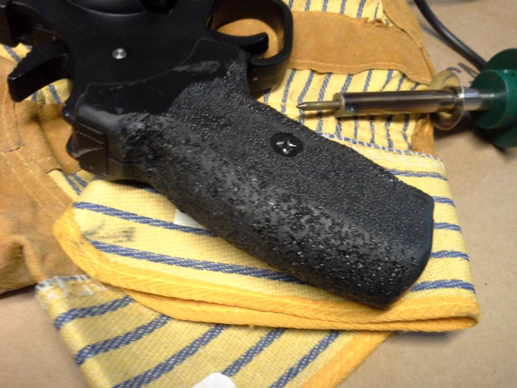 Én javaslom a markolat elejének ívét lekerekíteni, a szögletes kiemelkedéseket letompítani.Csakhogy így annyira nem lesz szép az eredmény (sőt), és fogása sem lesz tökéletes. Az öntési hibák miatt sajnos néhol gödrös lesz a felület. De főképpen az aggályos, ha lőtéri gyakorláskor szilikonzsíros lesz a kezünk a gumis változatok töltésénél, és a gyári markolat hajlamos ilyenkor csúszkálni. Érdesíteni kell!