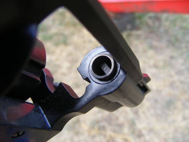A dob külső kivitelezése esztétikailag talán lehetne szebb is, miután a külső kikönnyítések kicsit szögletesnek tűnnek. Belül “szellős” könnyen tisztítható, a 9 mm-es rész után excentrikusan szűkül 7 mm-re. A felfúrás, buherálás ellen, egy kör alakú acélbetét van beleöntve a dob anyagába, ami csak kb. 2-2,5 mm-ert lóg be a töltényűrbe. A töltényűr furatai nem túl tágasak, de nem is szűkek, az összes töltényt könnyű volt behelyezni és az ellőtt töltényhüvelyeket minden esetben sikerült az ejektorrúddal kilökni.