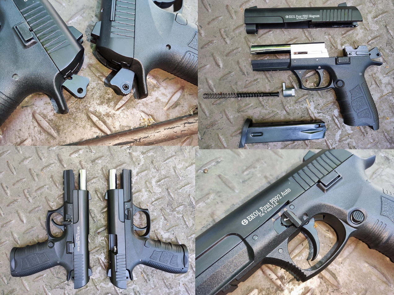 Az Ekol Firat PB92 modellek 9 mm PAK kaliberűek, tárkapacitásuk hivatalosan 16 db töltény, de nekem 17.et is sikerült begyömöszölni az acéltestű kétsoros tárba. A gázfegyverek műanyagtokosak, mely műanyagtokban elöl a fegyvercső, hátul a vezetőléc-elsütőszerkezet egység egy-egy spiáter tömbként kapott helyet. Mindkettő rendkívül masszív, de még ezt is felülmúlja a szán vaskossága: néhol a 6 mm-et is meghaladja, de a legvékonyabb pontokon is 3-4 mm cinkkel van dolgunk.