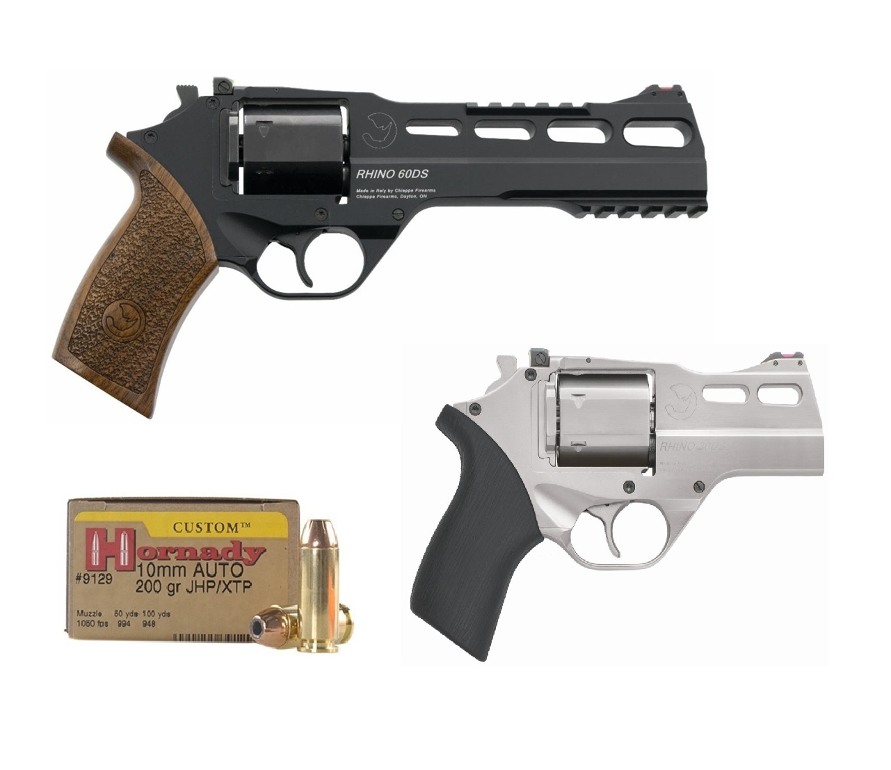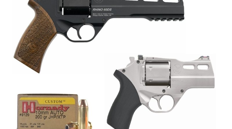 Pár évvel ezelőtt a 4″-es Chiappa Rhino revolverből volt egy kisebb széria 10 mm AUTO kaliberben, de az csendben eltűnt a piacról (bizonyára technikai problémák adódtak). Most azonban a 3″-es (30DS) és 6″ (60DS) modelleket ismét bejelentették az erős öntöltő pisztoly kaliberben. Az alsó dobfuratnál elhelyezett cső hatásosan csökkenthető az erős hátrarúgást, így jó választás lehet ezen intenzív kaliber számára. A hatlövetűség és alumíniumötvözet tok pedig megmaradt, így relatíve könnyű vadászönvédelmi fegyverként is szolgálhatnak (ahol az ilyesmi legális).