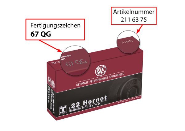 Az RWS lőszergyártó (RUAG Ammotec) visszahívta a .22 Hornet kaliberű, TMS (részköpenyes, hegyes lövedékes) 3,0 gramm lövedékkel szerelt vadászpuskalőszerét. A kaliber itthon is használt, és Európában és az USA-ban is elterjedt. A visszahívott sorozat 67QG jelzésű, a termék cikkszáma pedig 211 63 75.