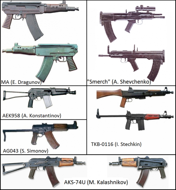 A TheFirearmBlog (TFB) oldal egy rnedkívül érdekes angol nyelvű cikket közölt, mely orosz forrásokra támaszkodva mutatja be az AKSz-74U (lásd: Kaliber 2016 TAVASZ) kompakt gépkarabély (PDW) korabeli versenytársait. Ezek között elképesztő műszaki alkotásokat találni, többségük, de nem mindegyikuk az 5,45×39 mm-es kalasnyikov-lőszert tüzeli. Mindegyiknek az volt a célja, hogy a nem lövészfegyverrel harcoló katona kezébe egy nagy tűzerejű, de kicsi és könnyű személyi önvédelmi fegyvert adjon. A fegyverekben megnyilvánuló innovatívitás elképesztő, főleg annak fényében, hogy tudható volt, hogy Mihail Tyimofejevics fegyverének van a legtöbb esélye.