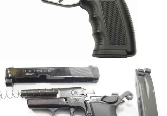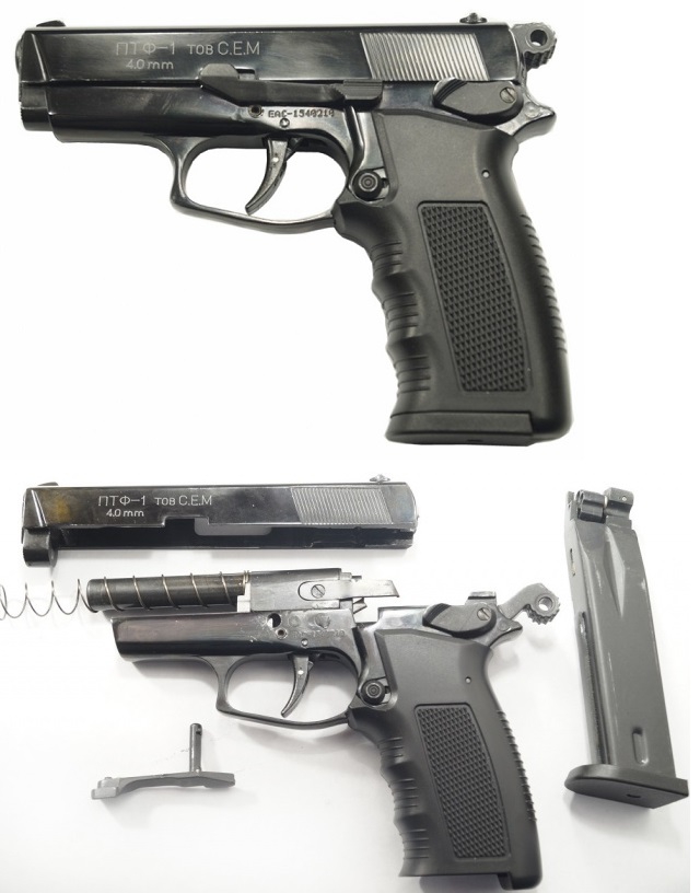 A teljesen ártalmatlan flóbert szobai céllövő fegyvereket ugyan 2004-ben lényegében betiltották Magyarországon, de számos országban továbbra is szabadon tarthatóak és igen népszerűek. Tavaly tűnt fel az uknrán boltokban a török Ekol Aras Compact modelljének érdekes flóbertpisztoly-kivitele. A ПТФ-1 (PTF-1) névre hallgató szerkezet a 4 mm Randzünder (flóbert) patronokat egy kis 5-lövetű revolverdobból tüzeli, mely a tárimitáció tetején foglal helyet, a kakas megfeszítésekor (akár kézzel, akár revolverezve, akár a szán hátramozgatásával) léptet. A DA/SA elsütőszerkezetű, sima csövű hobbifegyver ára Ukrajnában kb. 45 ezer forintnak felel meg. Torkolati energiája 7,5 J alatti, de ennek ellenére nálunk 2-8 év szabadságvesztés jár érte, ha valakinek nincsen rá lőfegyvertartási (LOL!!!) engedélye.