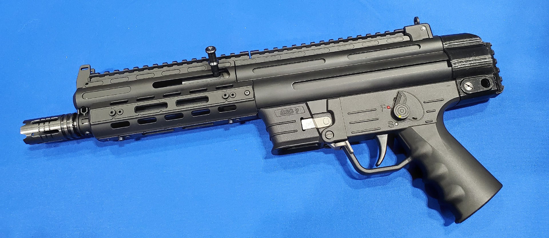 A német German Sport Guns újdonsága a GSG-9, ami a legendás HK MP5 formavilágát hozza, de természetesen csak szabad tömegzáras (görgős késleltetés nélküli) belső szerkezettel és acéllemez helyett cinköntvény tokfelsőrésszel, műanyag trigger group-pal. A jogilag az USA-ban pisztolykivitelnek 7,5″ csőhossza lesz, de várható válltámaszos, hosszabb csővel szerelt PCC-verzió is. A legérdekesebb tulajdonsága, hogy a tárfészke cserélhető és Glock (26, 19, 17 stb) és SIG P320 9 mm Luger tárakkal is üzemeltethető. Az előágy M-LOK rögzítési pontokat kapott, a tok tetején picatinny-sínek találhatóak, a biztosítókar pedig kétkezes. A fegyver ára természetesen töredéke egy MP5-ének, mindössze 750 USD az MSRP az USA-ban.