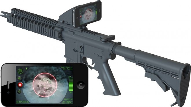 Már korábban is voltak olyan okostelefonos applikációk, melyek ballisztikai számítógépként tették használhatóvá a kütyüket. Most azonban konkrétan egy olyan szerelék készült, melybe az irányzóvonalra helyezett iPhone-t lehet felszerelni. A telefon kamerája a “céltávcső” optikája, míg a kijelző tulajdonképpen a szemlencse.