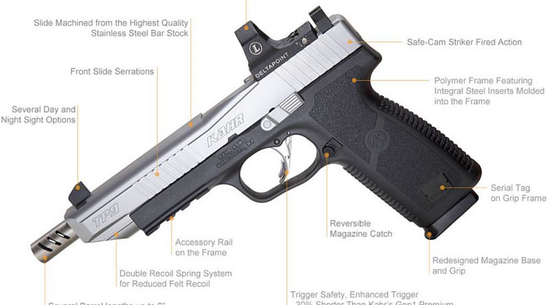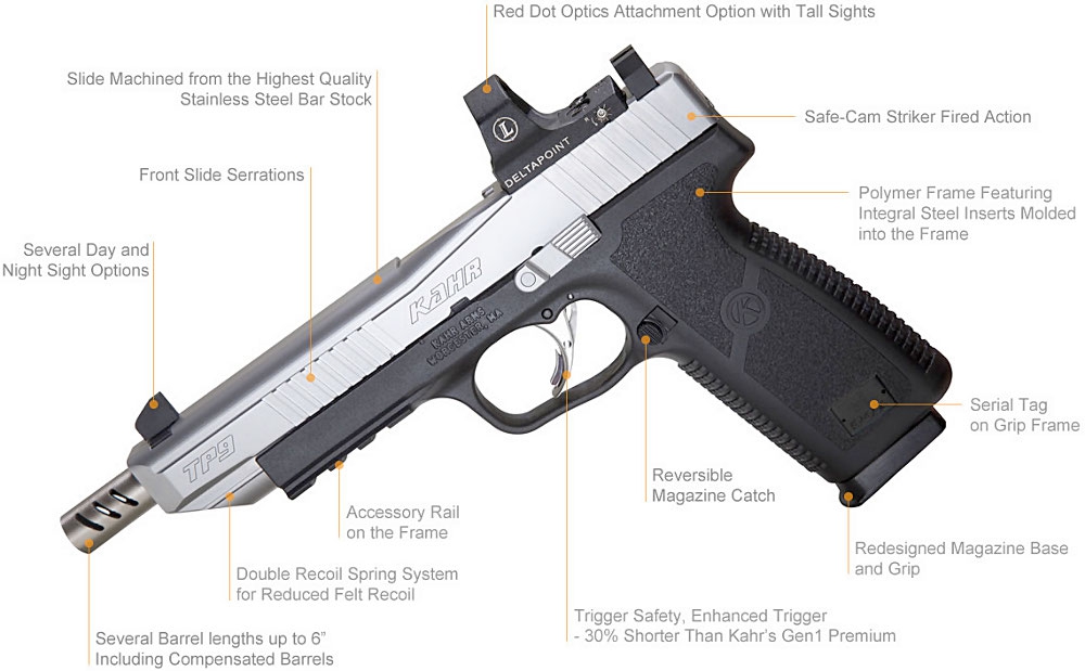 Az eddig kifejezetten önvédelmi célú, lapos, kakas nélküli DAO pisztolyaival hódító amerikai Kahr új területre igyekszik beférközni. Most TP9 Gen2 Premium néven egy 6″-es konmpenzátoros csővel és red dot-tal szerelt szános új modellt mutattak be, kifejezetten dinamikus sportlövészetre. No persze a versenyképesség az egysoros tár és a könnyű műanyagtok okán továbbra is nehezen értelmezhető. A fegyveren immár van szereléksín is, illetve új, sport-elsütőszerkezetet kapott, 30%-kal rövidebb sütési úttal, amihez glock-szerű billentyűbiztosító is tartozni fog.