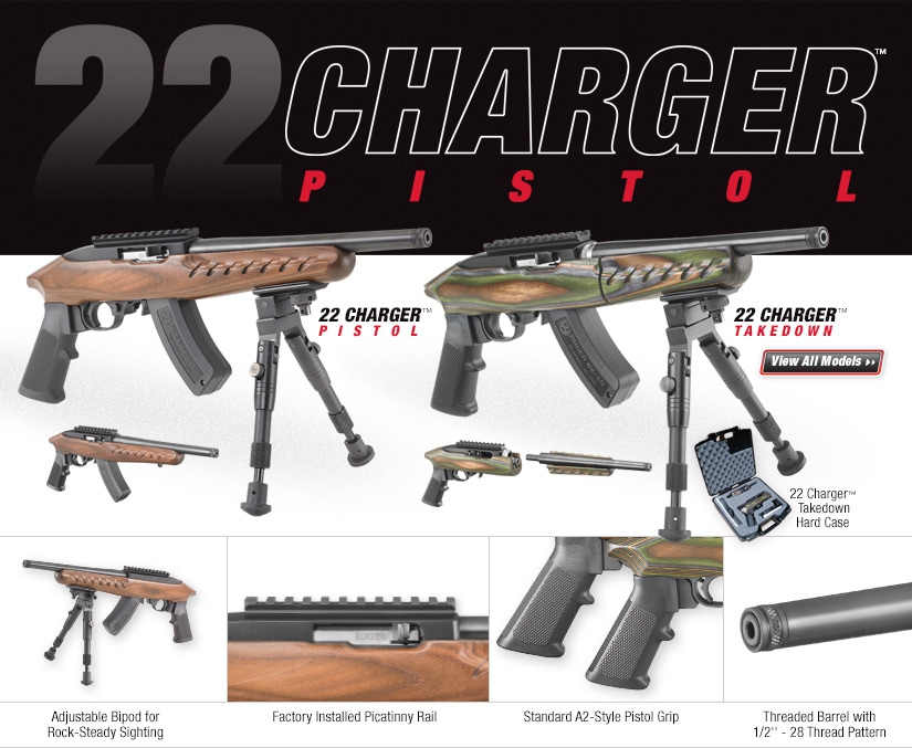 A Ruger bejelentette, hogy újrakezdi a .22 Long Rifle kaliberű 10/22 puska alapjaira épülő pisztolyok gyártását. A 22 Charger modell immáron új elsütőszerkezettel és alapkonfigurációban 15-lőszeres ívtárral szállítják, tokja tetején szereléksínnel. A fegyverek rétegelt lemez fa ágyazást kapnak, melyhez M16A2-kompatibilis pisztolymarkolat tartozik. A sportcélra (sziluettlövészet) és vadászatra gyártott fegyver kifejezetten olcsó (309 dollár az alapmodell, 409 dollár a szétszedhető kivitel.)