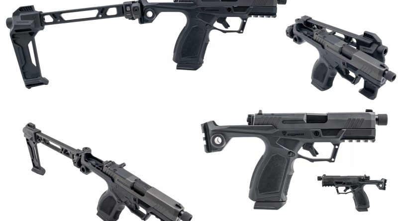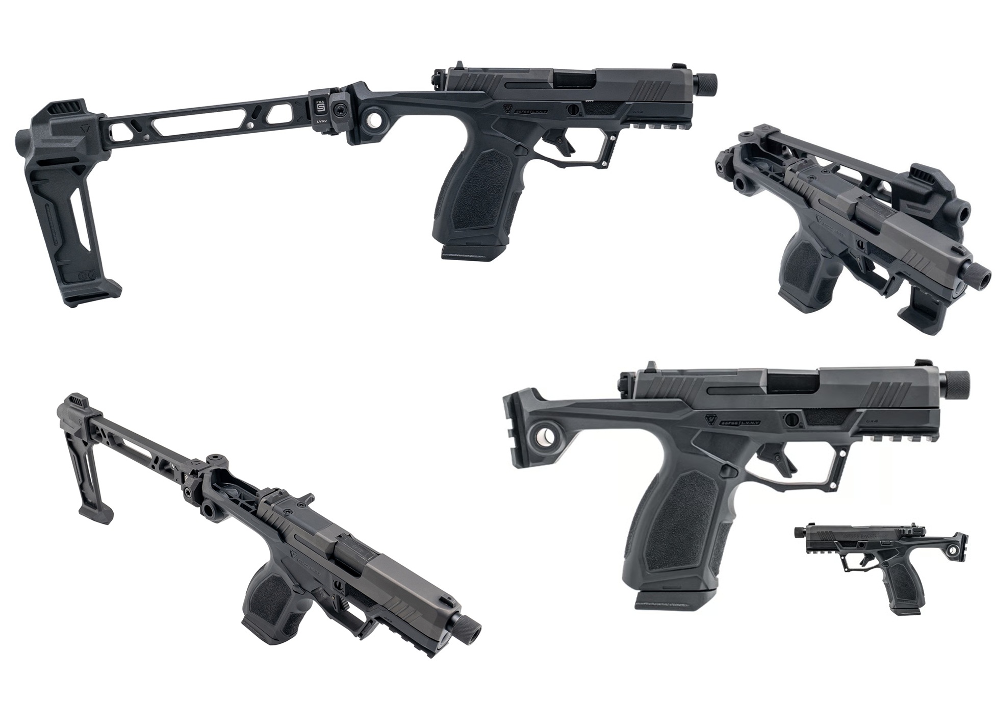 A vázrendszerre épülő SIG Sauer P320 és P365 pisztolymodelleket már kínálja a gyártó PDW-jellegű válltámaszos pisztoly konfigurációban, most pedig a Taurus követi a példát elsőként a nagy konkurensek közül*. Az amerikai Strike Industries-zel kollaborációban a GX4 (9 mm Luger, 15+1) készítettek egy Strike Bravo jelzésű modellt, ahol maga a műanyag külső pisztolytok a hódfarokrészen kb. 8 centivel meg van hosszabbítva, és egy függőleges állású szereléksínes szakaszban végződik – ide kerül a FSA Single Stabilizer az említett cégtől. Ez nem válltámasz jogilag az USA-ban, hanem egy behajtható alkartámasz (bár nem tilos vállba támasztani sem).
