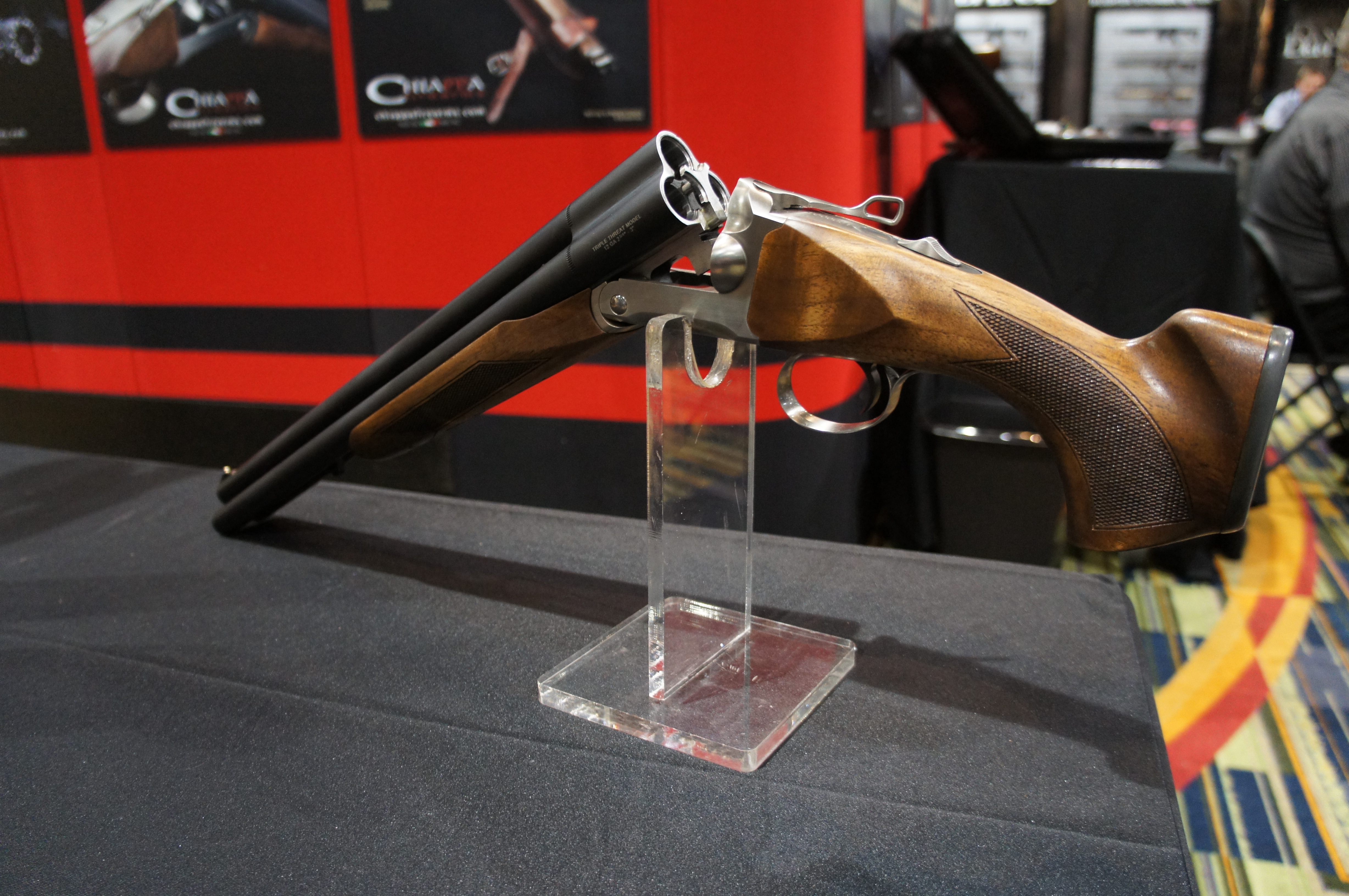 Az olasz Armi Chiappa egy igazán különleges sörétes puskát mutatott be. A Triple Threat nevezetű szerszám ugyanis 3-csövű 12/76os kaliberben, és csöve az USA-ban jogszabályilag engedélyezett minimális 18″, tusája pedig igencsak csutkára vágott. Kifejezetten lakásvédelmi vagy túlélőfegyvernek szánják, bár ehhez képest 1500 dollár körüli ára kissé meredek.