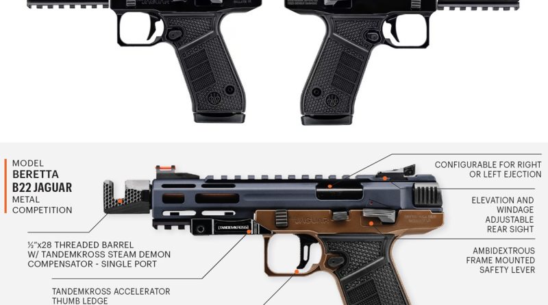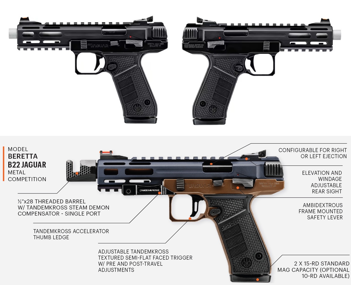 A Beretta több korábbi vitatható sikerességű (pl: U22 Neos) próbálkozás után ismét megpróbál visszatérni a .22 LR plinker sportpisztolyok piacára. Az új B22 Jaguar külsőre és felépítésében is némileg egy szögletesebb Ruger Mark IV-re hasonlít, azonban tárkapacitása 15 db lőszer. A szabad tömegzáras pisztoly alumínium tokfelsőrészében kapott helyet a fegyvercső és belül fut a zártest is, érdekesség, hogy a kivetőnyílás mindkét oldalon megtalálható, a kivetési irány átállítható. Bár, hogy ennek mi értelme egy maroklőfegyveren, az nehezen megfogalmazható. Enneél hasznosabb, hogy a biztosító kétkezes, viszont a zárakasztó csak jobbos. A fegyver tokfelsőrészének elején és tetején picatnny-síneket találunk.
