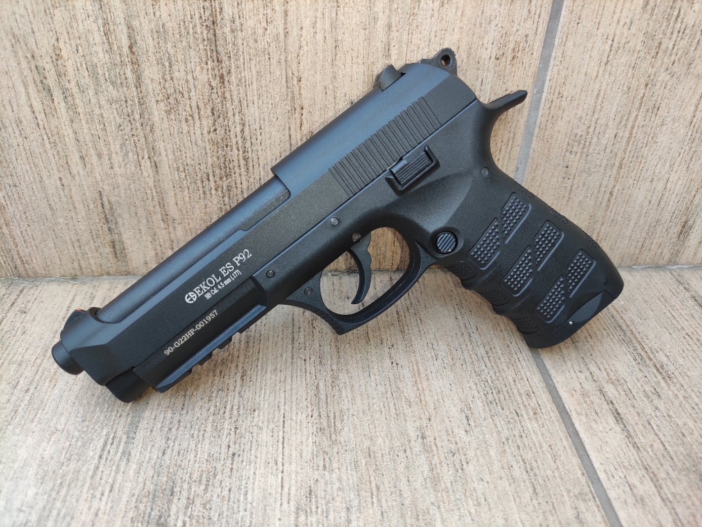 A török Ekol legújabb szén-dioxidos hobbi-légpisztolya, az ES P92 is megérkezett Magyarországra. Természetesen csodát nem kell várni, hiszen ez egy 40 ezer forint alatti kisker. árú sörösdobozgyilkos, de az elkészítési minősége egészen jónak mondható. A kivehető szekrénytár-imitáció tartalmazza a 4,5 mm-es rugós acél gömblövedék-tárat (a fegyver sima csövű), a 12 grammos patront és becsavaróját, valamint a szelepet.