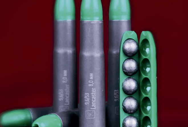 A jogilag sima csövű, Lancaster-féle ovális huzagolású fegyvercsövekhez való, 7,62×54 mm R-re alapuló hüvelyű 9,3×53 R Lancaster lőszer is ilyen. Ehhez alkottak most meg egy új töltetet, melynél egy leváló műanyagköpenyben 5 db 8 mm-es ólom gömblövedék helyezkedik el. Az egy sorban, közös hossztengellyel elhelyezkedő lövedékek kvázi forgás-stabilizáltként repülnek. 35 méteren 40 cm szóráskörben csapódnak be és a 490 m/s kezdősebességű lövedékeknek még ott is van annyi energiájuk, hogy egy 5 cm-es fenyődeszkát átütnek.