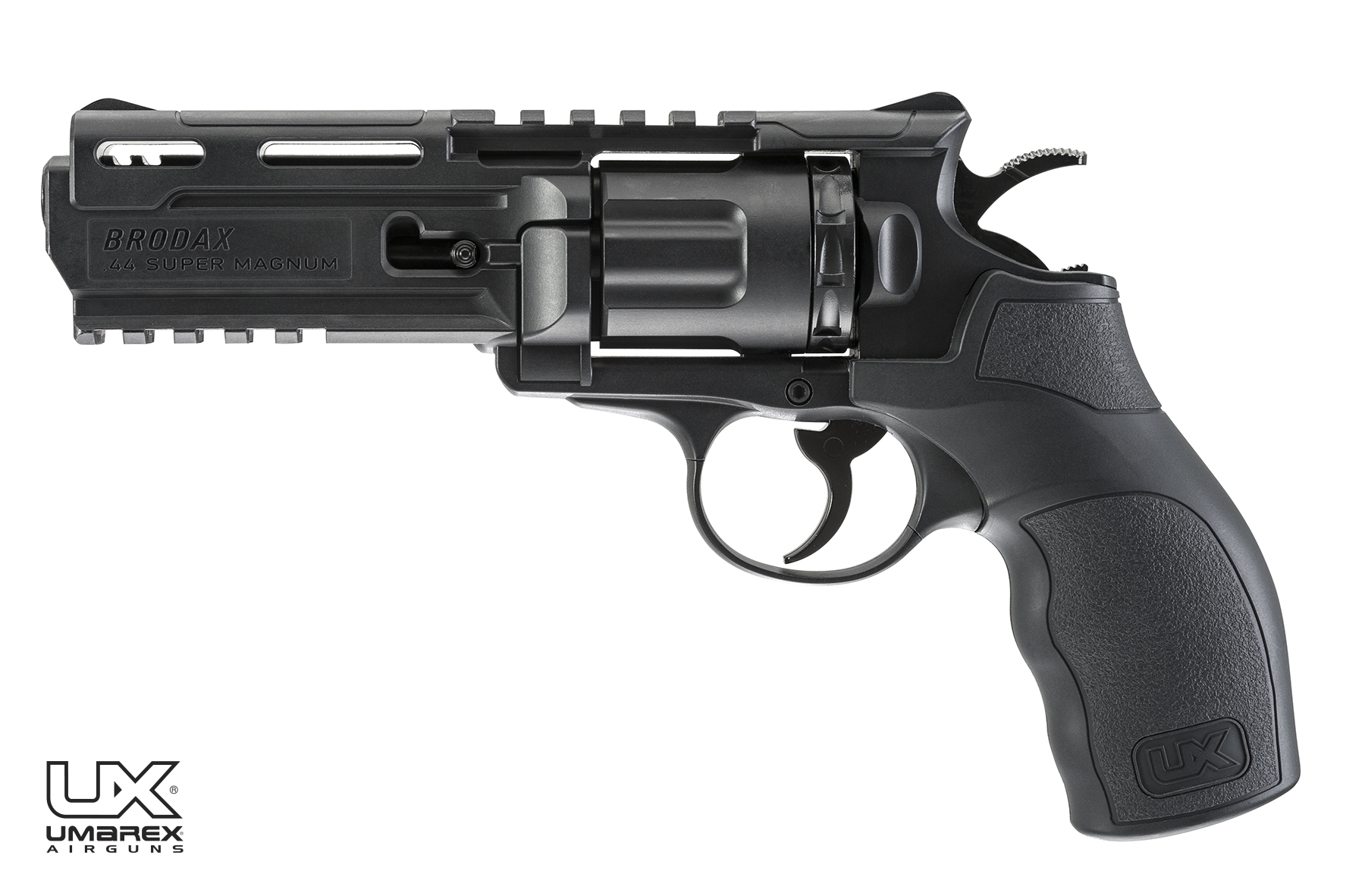 Sci-fi-be illő designnal bíró légfegyvert mutatott be az Umarex amerikai részlege. A Brodax revolver markolatban elhelyezett 12 grammos CO2-patronról üzemel, jórészt műanyagból készült, DA/SA (cink) elsütőszerkezettel. A légrevolver sima csövű, 10-lövetű 4,5 mm-es acél BB gömblövedékekből. A dobhátsórész forog csak, azt is kell kivenni töltéshez.