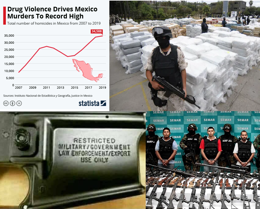 Mint ismeretes, Mexikóban rendkívül szigorúak a fegyverjogszabályok, a civilek legálisan szinte nem tarthatnak lőfegyvert, ennek ellenére a drogkartellek állig fel vannak fegyverkezve és végtelenül korrupt rendvédelmi szervekkel szabályos háborúkat vívnak és gyakorlatilag az ország egyes területeit katonailag is ellenőrzik. Mexikóban az USA-hoz képest lakosságarányosan átlagosan ötször annyi lőfegyveres emberölés történik, mint az USA-ban.