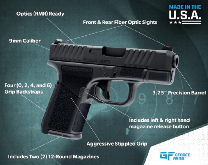 Az amerikia önvédelmi pisztoly piac gigantikus mivolta mindenféle próbálkozásoknak teret ad. Ide sorolható a Gforce Arms legfrissebb modellje*, a GF9 Equalizer (azaz kiegyenlítő). Főként az benne az érdekes, hogy formailag a HS/Springfield Hellcat H11 és a Glock 26 valamiféle keveréke, de Glock26 kompatibiltást ígérnek. A pisztolyka tárkapacitása 12 db 9 mm Luger lőszer, csőhossza 3,25″ (de ez legalább “preszízsön”:-)), a műanyagtokhoz 4-féle hátsó makrolatpanel is tartozik. A szánra red dot előkészítés és fénygyűjtő szálas irányzékok kerültek, ára pedig 399 dollár lesz (MSRP).