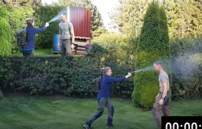 Az alábbi videóban látható egy humán teszt hatása egy ilyen, Bodyguard fantázianevű, terítő szórófejes mentol-spray-vel, melyben kb. 1 méterről fúj a hölgy, a hatótáv kb. 1,5-2 méter. Látható, hogy az 1 másodpercnél rövidebb találat hatására kb. 30 másodpercre harcképtelenné vált a “támadó”, így ha nem csak játszadoztak volna, bőven lett volna ideje a megtámadottnak elmenekülni/fizikai erőszakot alkalmazni.