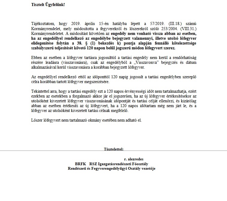 A napokban az összes fegyverkereskedelmi egység az alábbi tájékoztatót kapta a rendőrség igazgatásrendészetétől.