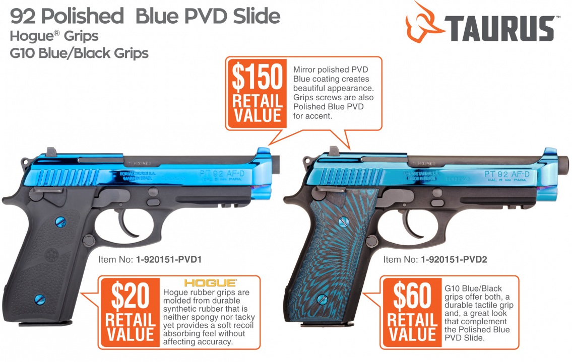 Az iparágban tapasztalható innováció-hiányt jól mutatja a brazil Taurus által bemutatott új PT92 pisztolyváltozat, melynél a szán és a markolathéj-csavarok is fényesre polírozottak és KÉK színűek. A markolat gumi, vagy KÉK-fekete G10. Az már csak hab a tortán, hogy KÉK szín kifejezetten a nem halálos gyakorló/kiképző fegyverek megszokott színének számít (Simunition), és maga a Taurus is gyártott KÉKben ilyen rendszert.