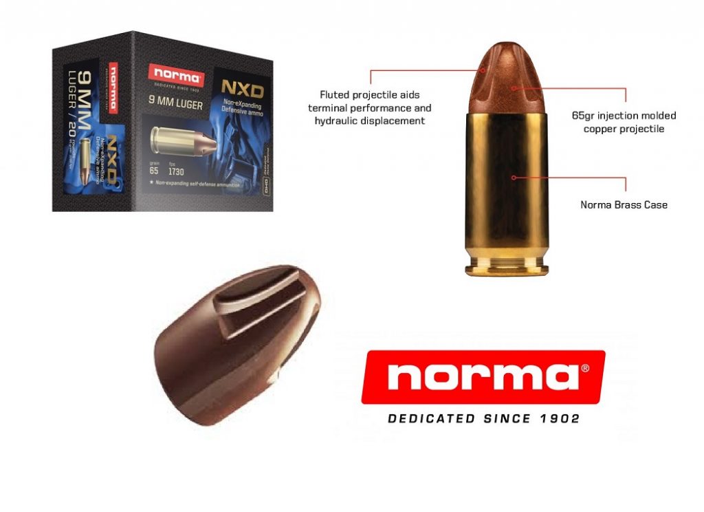 Az Inceptor ARX vagy a Ruger Polycase-hez hasonló formájú, nem-expanzív önvédelmi lőszert mutatott be a Norma. A 9 mm Luger kaliberben készülő Norma NXD lövedéke rézpor töltőanyaggal nehezebbé tett műanyag, mindössze 65 grain (4,21 gramm) tömeggel, azaz fele körül a megszokott lövedéktömegnek, ehhez azonban igen magas 1750 fps (533 m/s), azaz kb. 600 joule a torkolati energia. Azért, hogy nagy sebességgel becsapódó lövedék szövetroncsolást okozzon nem üreges, hanem oldalán vannak bemarások, melyek elvileg folyadékba vagy elasztikus anyagba csapódva kavitációt okoznak.