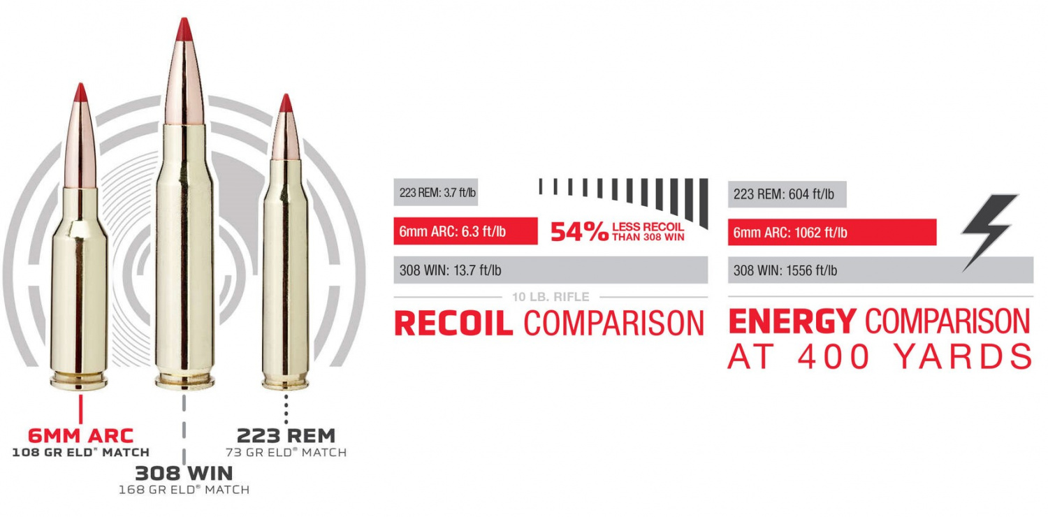 Egy újabb – megjósolhatóan pár éven belül kihaló – kalibert mutatott be a Hornady lőszergyár 6 mm Advanced Rifle Cartridge név alatt, így a magyar nyelvű szójáték adja magát. A 6 mm ARC egy újabb, immár sokadik “kövér hüvelyes” 6 mm (körüli) lőszer, mely úgy készült, hogy az AR-15 fegyverekből csőcserével/zárfejcserével tüzelhető legyen, bár eredetileg benchrest pontlövők használnak hasonlóakat. A 6 mm ARC-ot 103, 105 és 108 graines ELD-X, BTHP, és ELD Match lövedékekkel szerelve fogják forgalmazni. A sajtóanyagban megadott ballisztikai adatok felettébb impresszívek, de mivel 24″-es mérőcsőből mérik, így a gyakorlati képességek tekintetében maximum tájékoztató jellegűek.