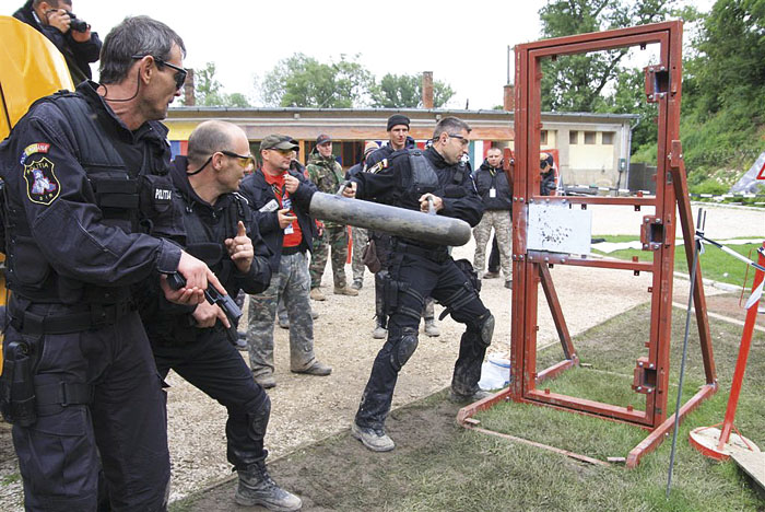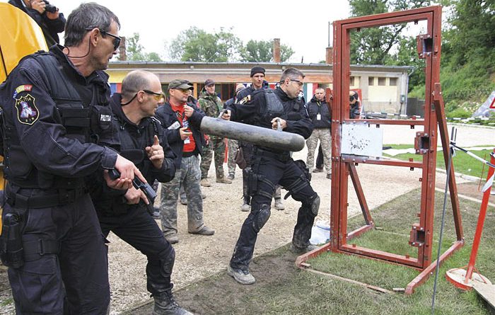 A csapat az ajtó előtt foglalt helyet, a kost kezelő az ajtó bal, a másik kettő a jobb oldalán, pisztollyal a kézben várta a jelet. Informatikusként viszonylag ritkán török be ajtókat (a WC-ajtó is túlélte hajnalban), ezért most megragadtam az alkalmat, és vállaltam a kossal történő finom munkálatokat. Akik már csináltak ilyesmit, átlagosan 2?3 ütéssel átjutottak az ajtón, de volt, akinek elsőre sikerült betörnie. Tapasztalat hiányában én nem tudtam pont merőlegesen ütést mérni a zárszerkezetet jelző acéllapra, így csak ötödjére törtek ki a fából készült stiftek a helyükről. Mint később megtudtam, az erősséget egy közepes zár szintjére kalibrálták.