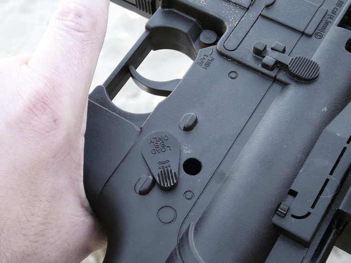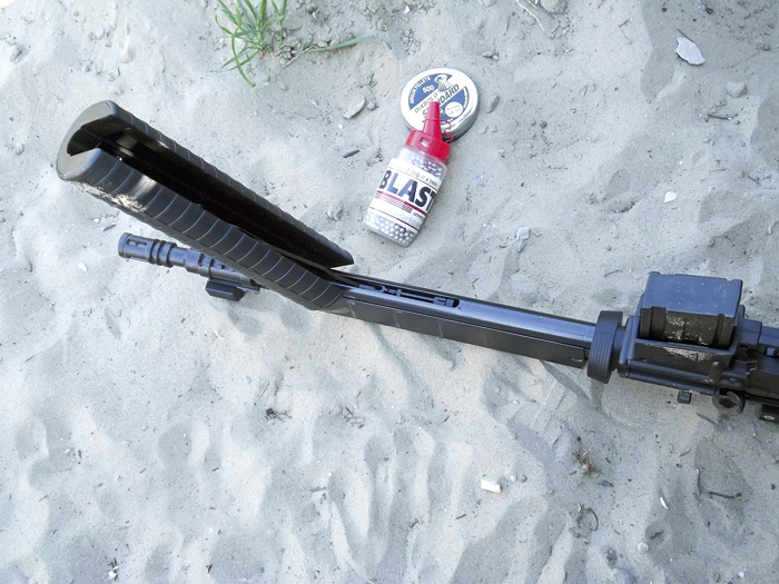 Azt már láttuk, hogy az előagy igazából pumpálásra szolgál. De nézzük meg a tárat is. Bizony, ezt már kivenni sem úgy kell, mint a rendes M4-esen, hanem pusztán össze kell nyomnunk a műanyagot elöl-hátul. Ez a ?tár? ugyanis nem tár, csak egy belül üres műanyagdarab, itt lehet például tartalék lövedéket szállítani.
