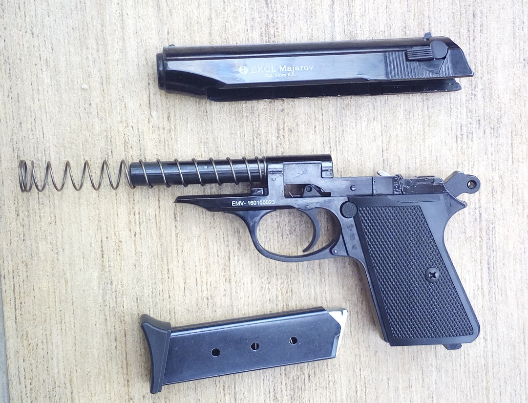 A tár kivétrele után elleőrizzük a töltetlenséget, hogy részlegesen szétszerelhessük a fegyvert. Ez a PP-külsőnek megfelelően a sátorvas lehúzásával, majd a szán ütközésig hátrahúzásával és felmelésével történik. A helyretoló rugó a cső körül található, mint az igazinál.