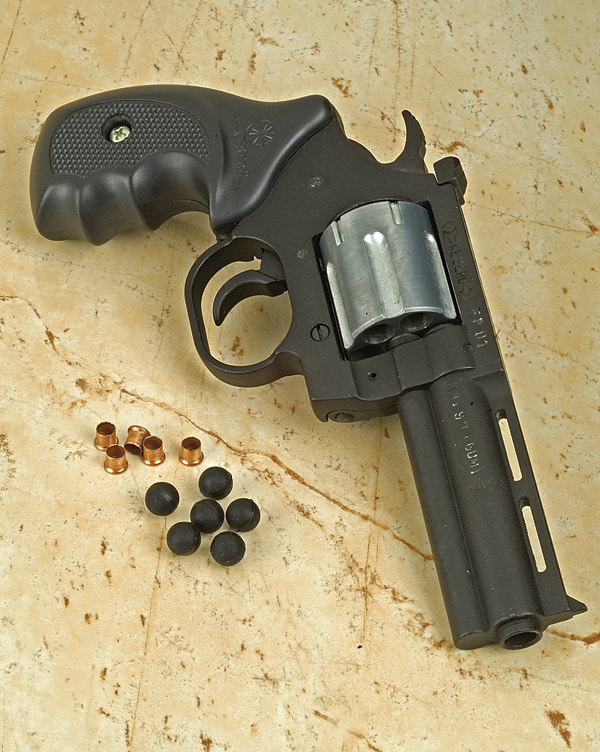 A gumilövedékes, elöltöltős revolver dobja a tok bal oldalán levő dobnyitó gomba hátrahúzása után nyitható oldalra – eddig semmi különbség a jól ismert, nagy számban eladott flóbert vagy 7,5 J alatti gumilövedékesekhez képest.