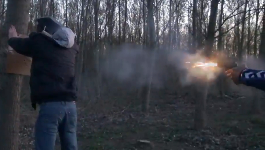 Ezúttal MaxWell125, a www.9mm.hu fórumozója vállalta be a hős/áldozati bárány szerepét. kb. 3 méter távolságból lövette meg magát – RÁDUPLÁZVA – egy Keserű Pitbull gumilövedékes gázrevolverrel (lásd korábbi videónk a fegyverről: http://www.kaliberinfo.hu/fegyvervideok/keser%C5%B1-pitbull-m12-es-magnum-defender-m ). Ebbe azonban csak 10 mm-es (jóval könnyebb és kisebb lefojtottságot, sebességet eredményező) gumilövedéket tettek, nem a bele való 12 mm-est. A kivetőtöltény Umarex volt, így a gyári 40-50 joule-os torkolati energiából legjobb esetben is maximum 25-30 J lett. A védőruházat is extrém vastag volt: 2 poló, 2-3 pullóver és egy télikabát. Ehhez képest a magyar nyelv ízesebb kifejezései is elhangzanak…