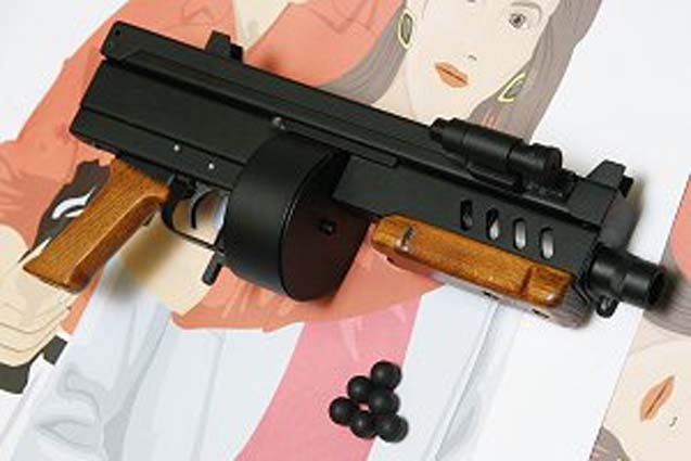 18 mm-es gumilövedékes muzeális lakásvédelmi fegyver, 12-lövetű óriási forgódobbal, 9 mm R Knall kivetőtölténnyel. 80-120 joule torkolati energia. Acéltok, acél szerkezetk, alu dob.