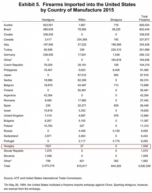 Most tették közzé az USA fegyvergyártási és import számait 2015-re (https://www.atf.gov/resource-center/docs/2016-firearms-commerce-united-states/download). Ebből kiderül, hogy a 2015-ös évben Magyarország több, mint 1500 db pisztolyt vitt ki az USA-ba holott ilyen fegyvereket nálunk nem gyártanak már régen. Valószínűleg a rendszerből kivont rendőrségi és honvédségi fegyverek (surplus) kerülhettek ki. Ugyanez magyarázhatja az Egyesült Királyság pisztolykivitelét is, ahol a Glock 17 katonai rendszeresítése miatt szabadulhatnak a régebbi fegyverektől. Ezekkel szemben a Cseh Köztársaság 76 ezer maroklőfegyvert és 28 ezer puskát vitt ki a világ legnagyobb fegyverpiacára, a CZ és az Alfa cégeknek köszönhetően. A rekorder persze szintén Monarchia tagja: Ausztria 900 ezernél több fegyvert, jórészt pisztolyt vitt ki, nyilvánvalóan a Glock és kisebb mértékben a Steyr-Mannlicher munkásságaként.