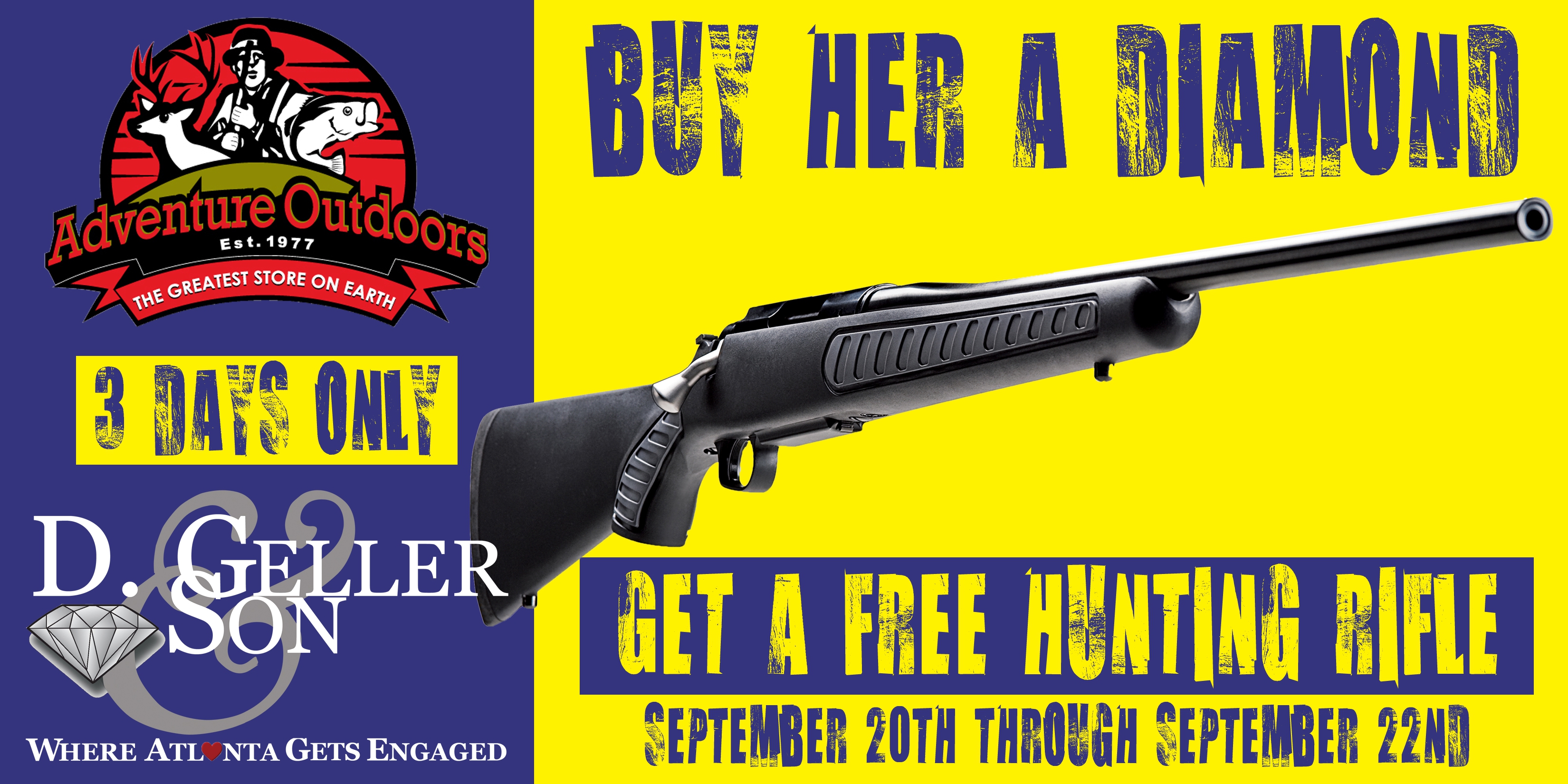 “Asszonynak gyémánt, férjnek ingyenpuska” így lehetne összefoglalni az USA-beli Atlanta (Georgia állam) ékszerészének különös akcióját. A D. Geller & Sons üzleteiben aki gyémántot tartalmazó ékszert vásárol legalább 2500 dollár értékben a megadott napokon, az kap egy kupont, melyet egy ajándék (kb. 430 dolláros) forgó-tolózáras vadászpuskára válthat be a közeli fegyverboltban.
