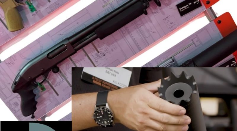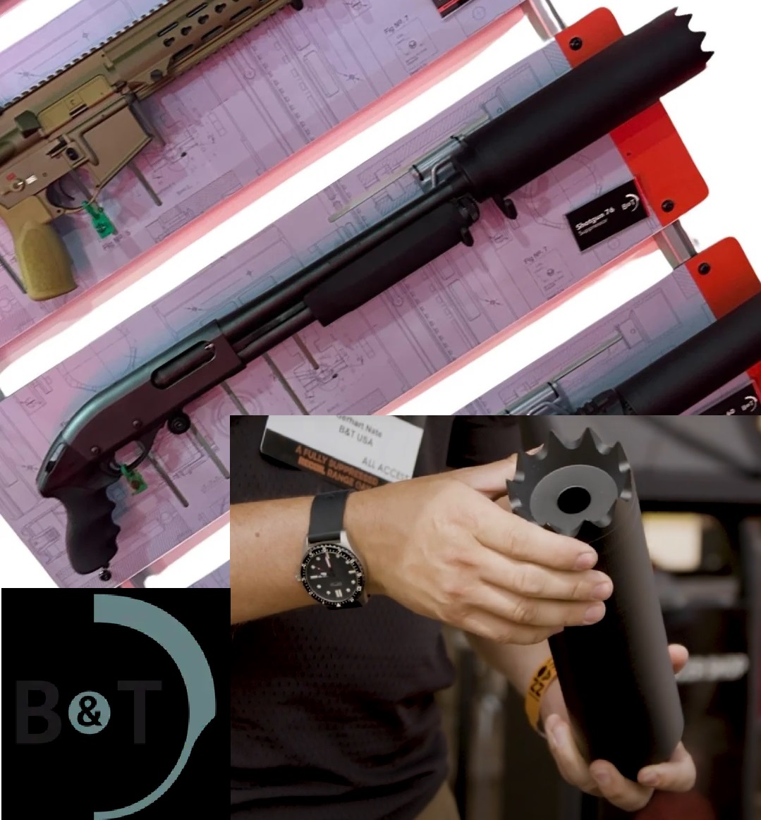 A svájci “luxus-butik-taktikai-felszerelésgyártó”, a B+T kiterjedt hangtompító.kínálatából eleddig hiányzott a sörétes puskákra való csendesítő. Most azonban bemutatták a 12-ga Breaching Shotgun Suppressor-t, azaz egy olyan nagyméretű (kb. két félliteres sörösdoboznyi) hangtompítót, mely kifejezetten az ajtózsanérok beszakítására optimalizált. A 12-es sörétesek csőtorkolatára szerlehető hangtompító eleje “cakkos” kiképzésű, hogy stabilan fel lehessen támasztani az ajtón, de fölös gáznyomás és szilánkok oldalra eltávozhassanak.