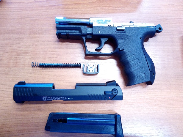 A másik talán érdekesebb, hiszen a nagyon népszerű, lapos és könnyű Umarex Walther P22 másolata külsejében (árában meg alig több, mint fele). Ez is csupán 527 gramm, egysoros tárja van. A tárkioldó viszont nyomógombos, és sajnos nincsen revolverező üzemmódja az elsütőszerkezetének (tehát csak cső alá töltve javasolt viselni), valamint a kakasban sincs acélbetét. Ellenben az alap P22-től eltérően a szétszedőpanel vaskos acélbetétet kapott.
